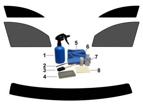 4) Kit #1, Werkzeugsatz, Sprühflasche mit Filter, Montageschaber, Mikrofasertuch, grobes Reinigungstuch,